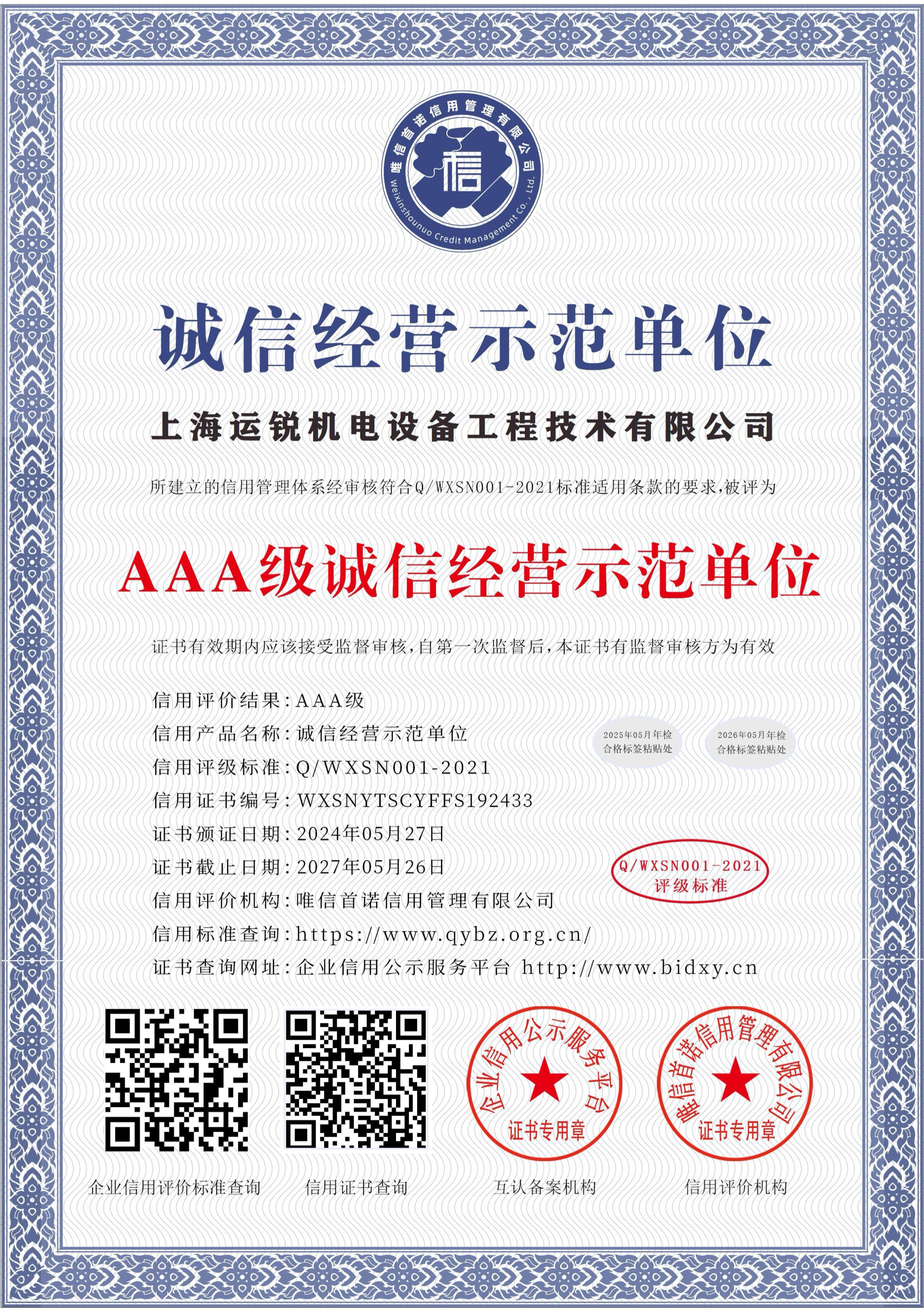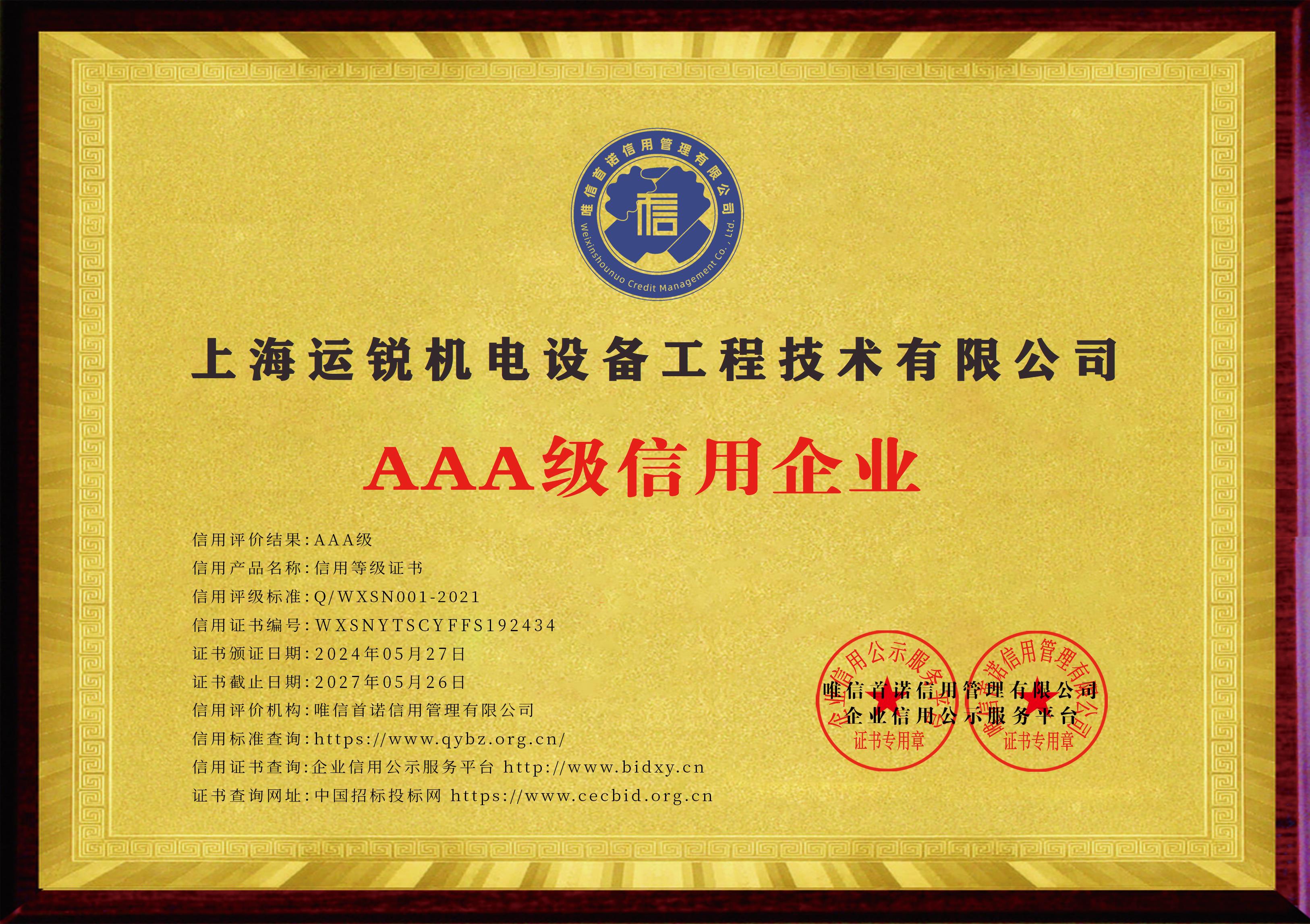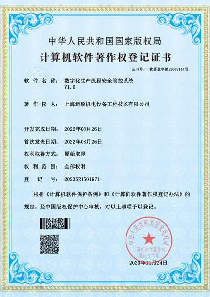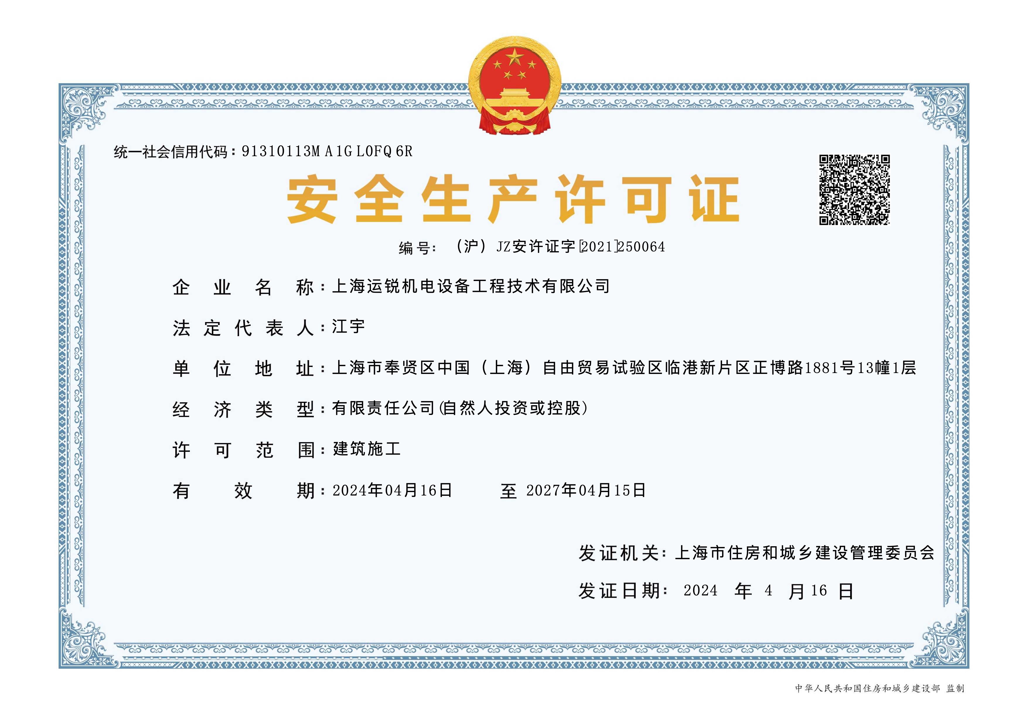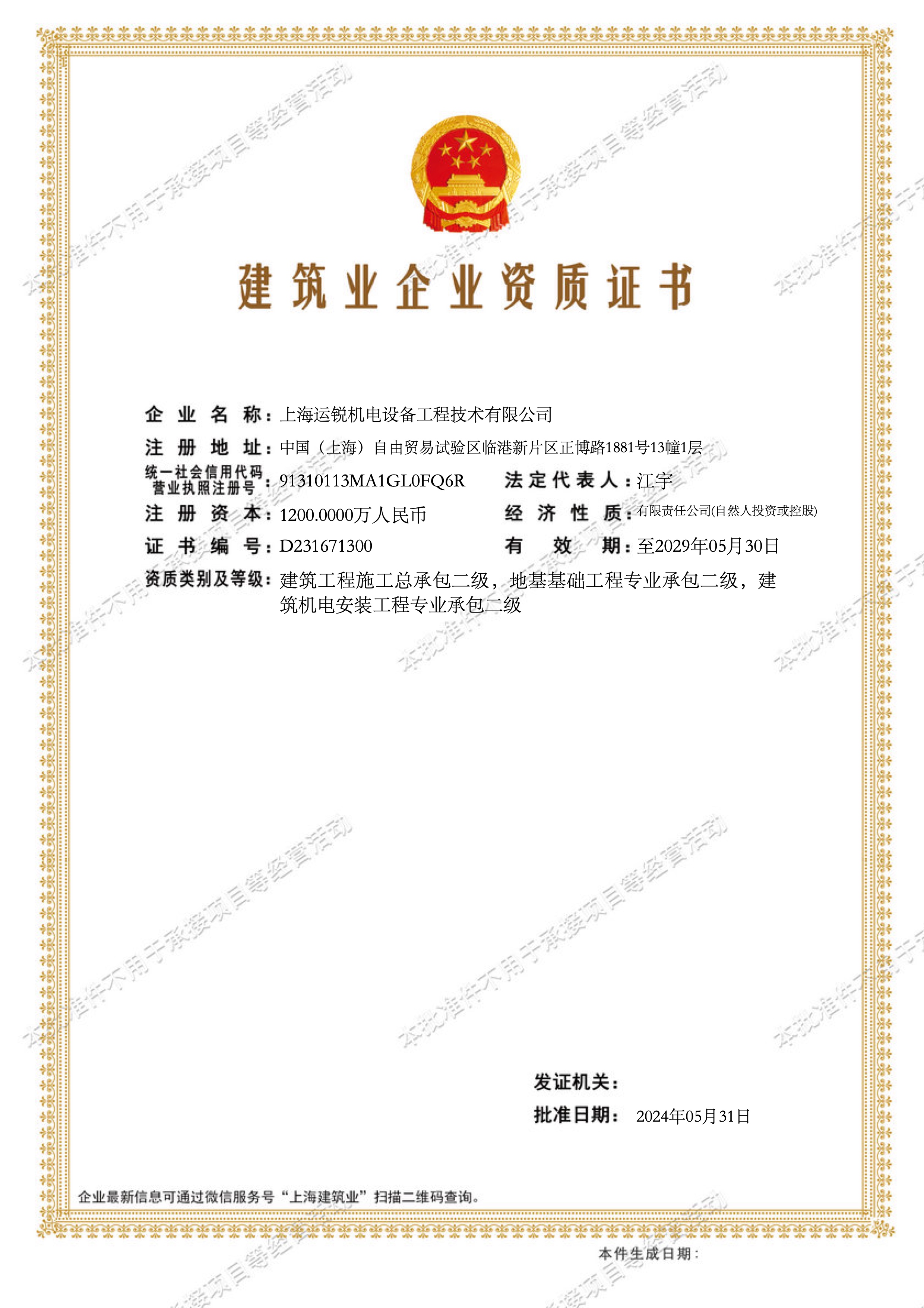 Yunrui был утвержден в качестве сертификата квалификации строительного предприятия, выданного Шанхайской комиссией по жилищному строительству и развитию городских сельских районов, став единственным производителем оборудования в отрасли, который одновременно обладает квалификацией для генерального подряда строительных проектов, профессионального подряда производства и установки стальных конструкций, профессионального подряда фундаментальной инженерии и профессионального подряда строительной электромеханической установки.