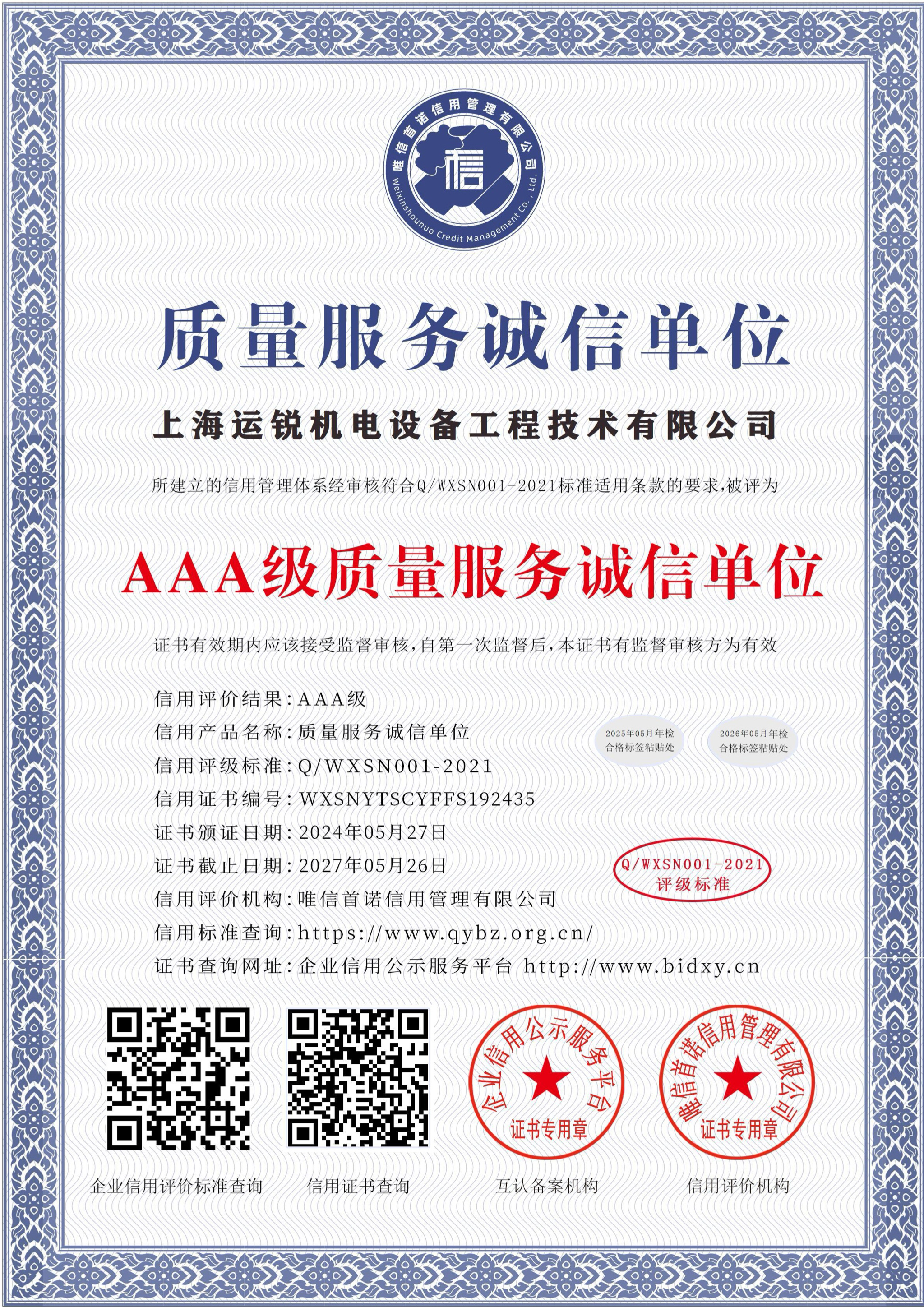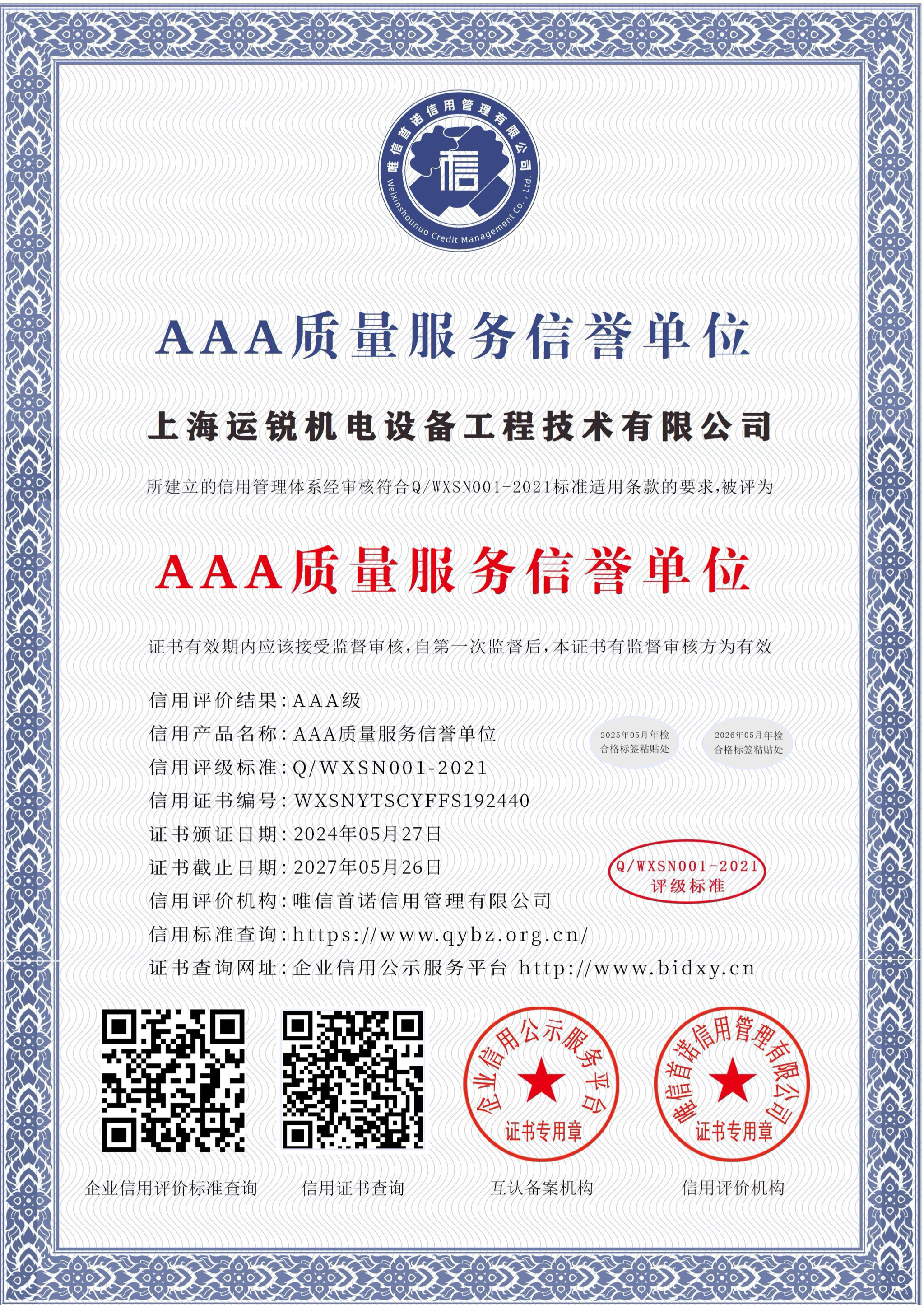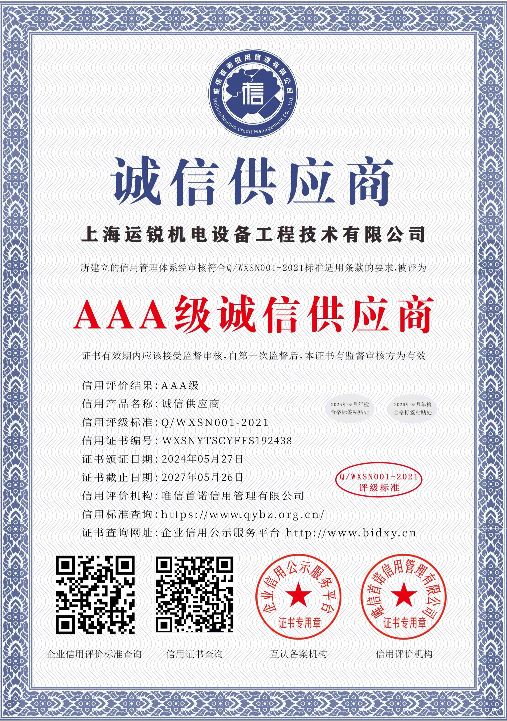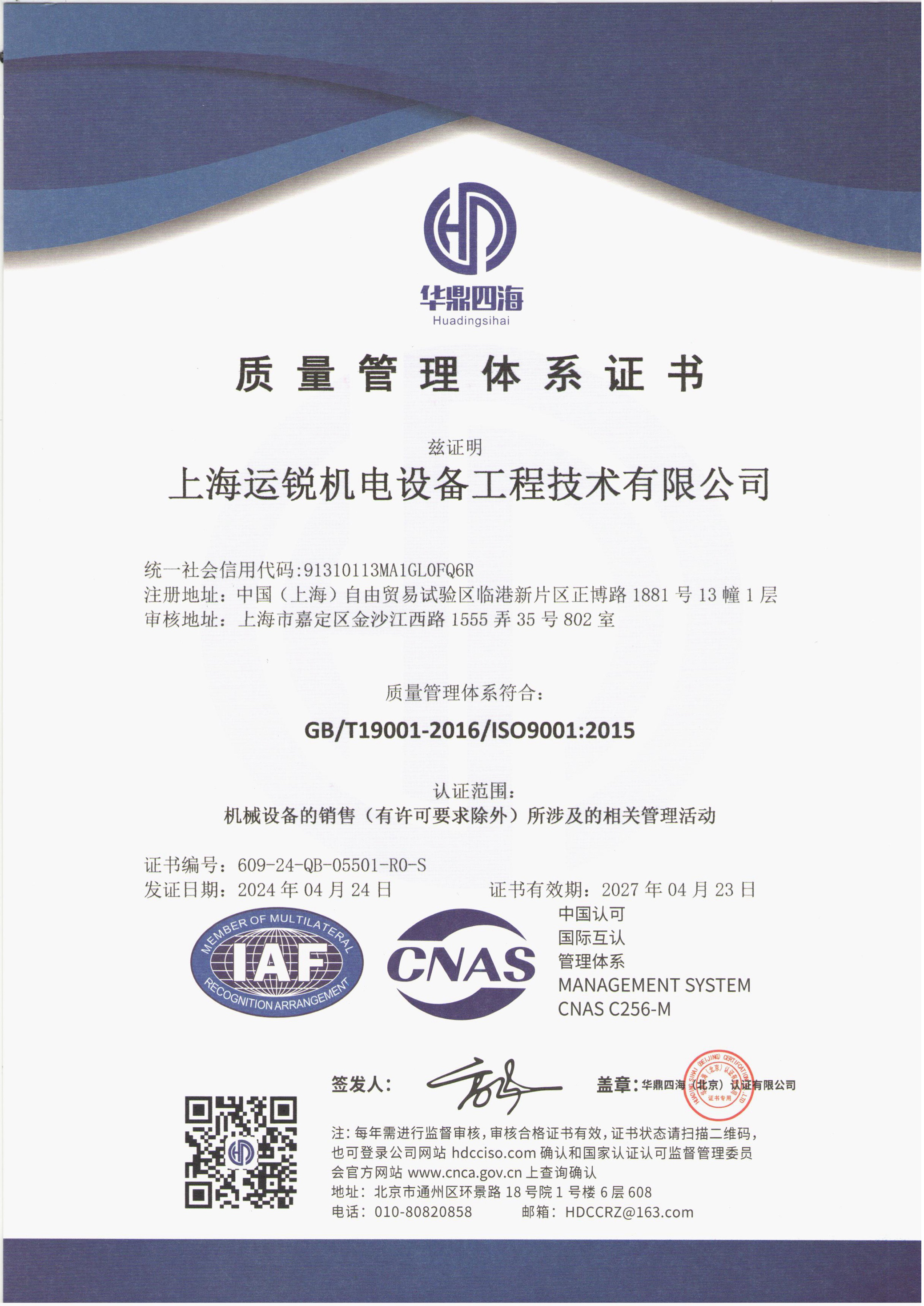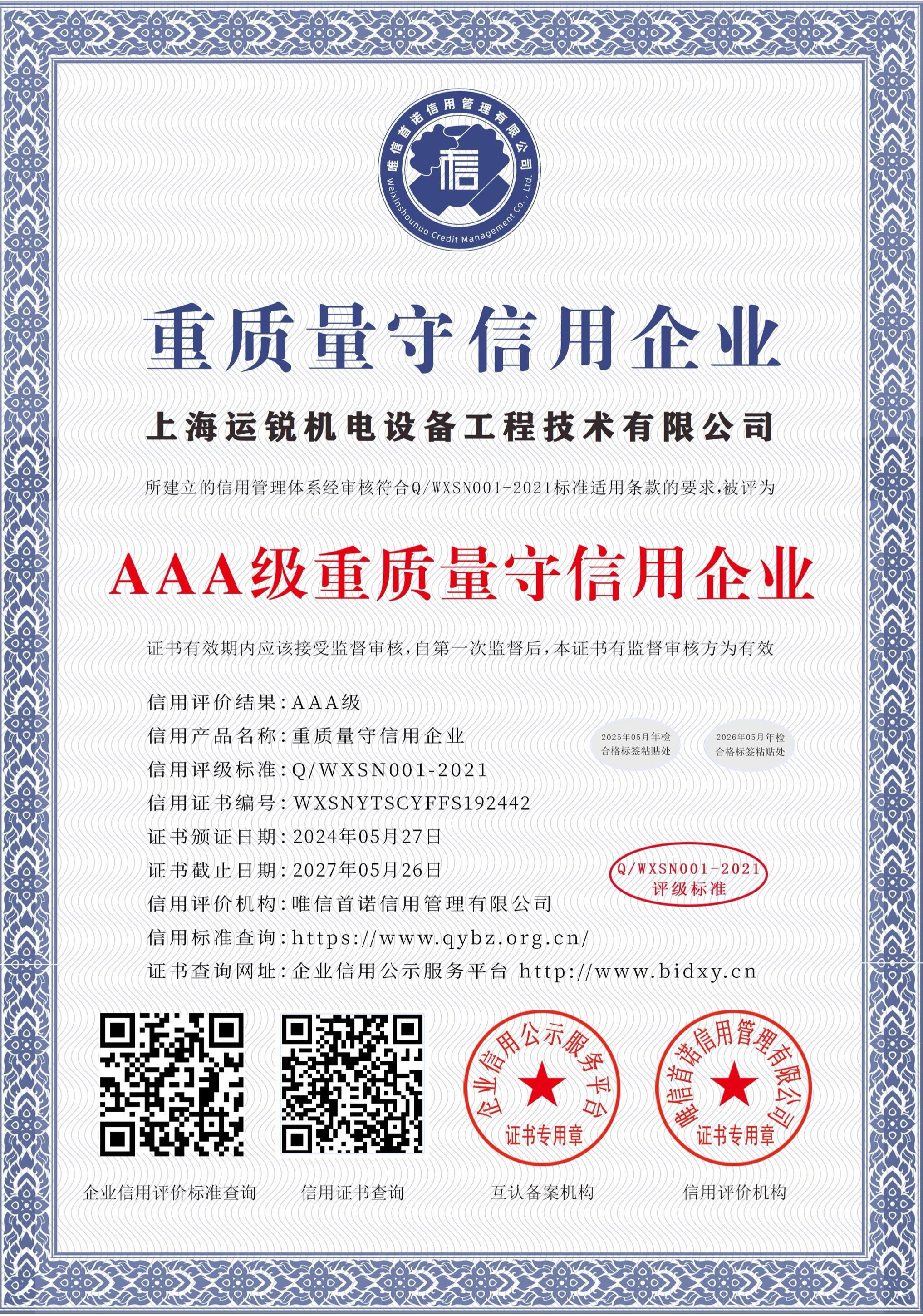 Yunrui был утвержден в качестве сертификата квалификации строительного предприятия, выданного Шанхайской комиссией по жилищному строительству и развитию городских сельских районов, став единственным производителем оборудования в отрасли, который одновременно обладает квалификацией для генерального подряда строительных проектов, профессионального подряда производства и установки стальных конструкций, профессионального подряда фундаментальной инженерии и профессионального подряда строительной электромеханической установки.